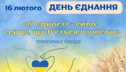 16 лютого у ВСП «Брянківський фаховий коледж ДЗ «Луганський національний університет імені Тараса Шевченка» пройшла тематична бесіда «У єдності - сила: серце, що б’ється в унісон», присвячена ДНЮ ЄДНАННЯ.